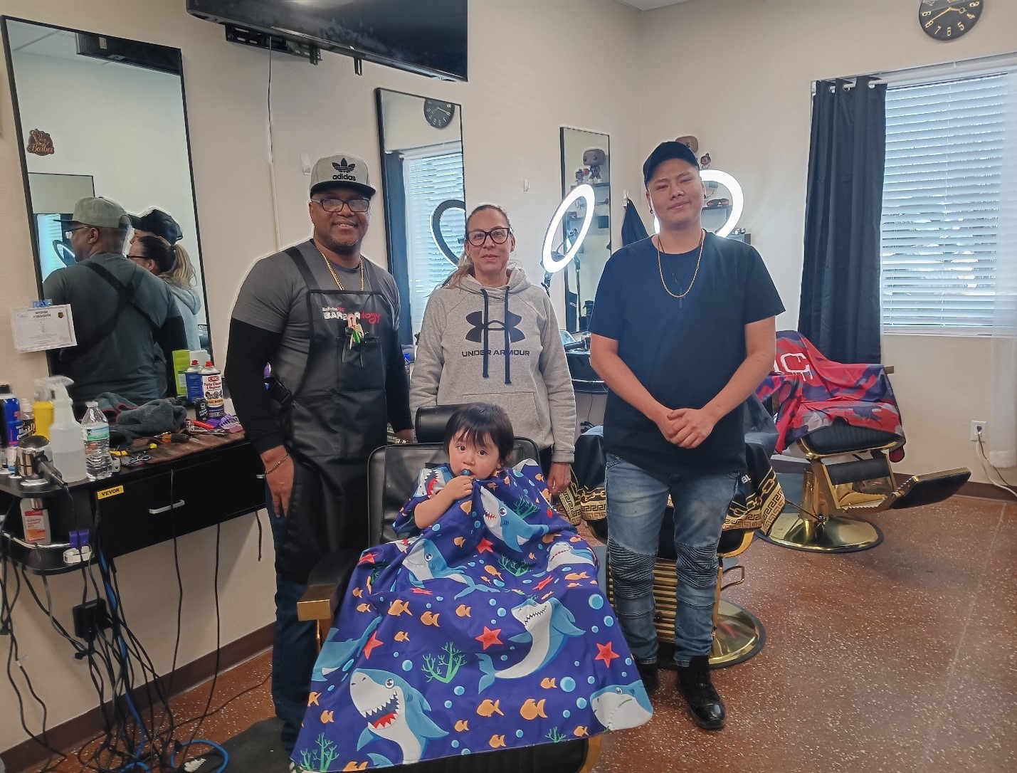 Morning Star Elite crew: Cedric Neal, Master Barber; Bobbi Jo Limberhand, owner and Lucas Morrision, barber and weekday manager. Customer is one-year old Rylee Tallbull. (Photo by Clara Caufield)