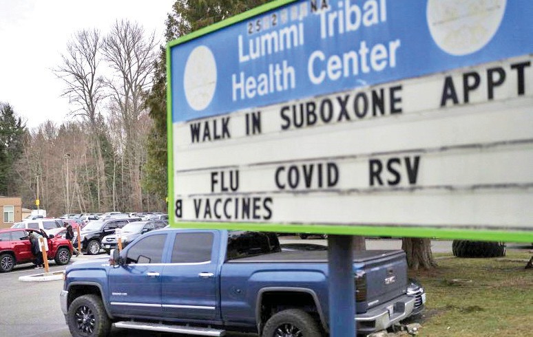 People walk through the parking lot of the Lummi Tribal Health Center on the Lummi Reservation, near Bellingham, Washington. (AP Photo/Lindsey Wasson, File)