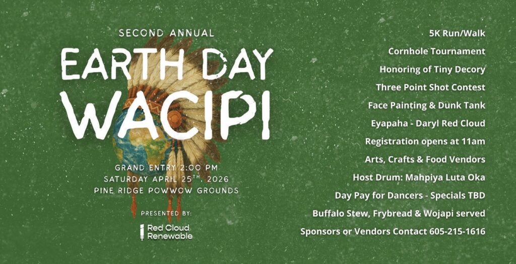 PINE RIDGE — Red Cloud Renewable will host the Second Annual Earth Day Powwow on Saturday, April 25, bringing together dancers, families, and community members from across the Pine Ridge Reservation and the region. The celebration will run from sunrise to sunset at the Pine Ridge Powwow Grounds, with Grand Entry scheduled for 2:00 p.m.