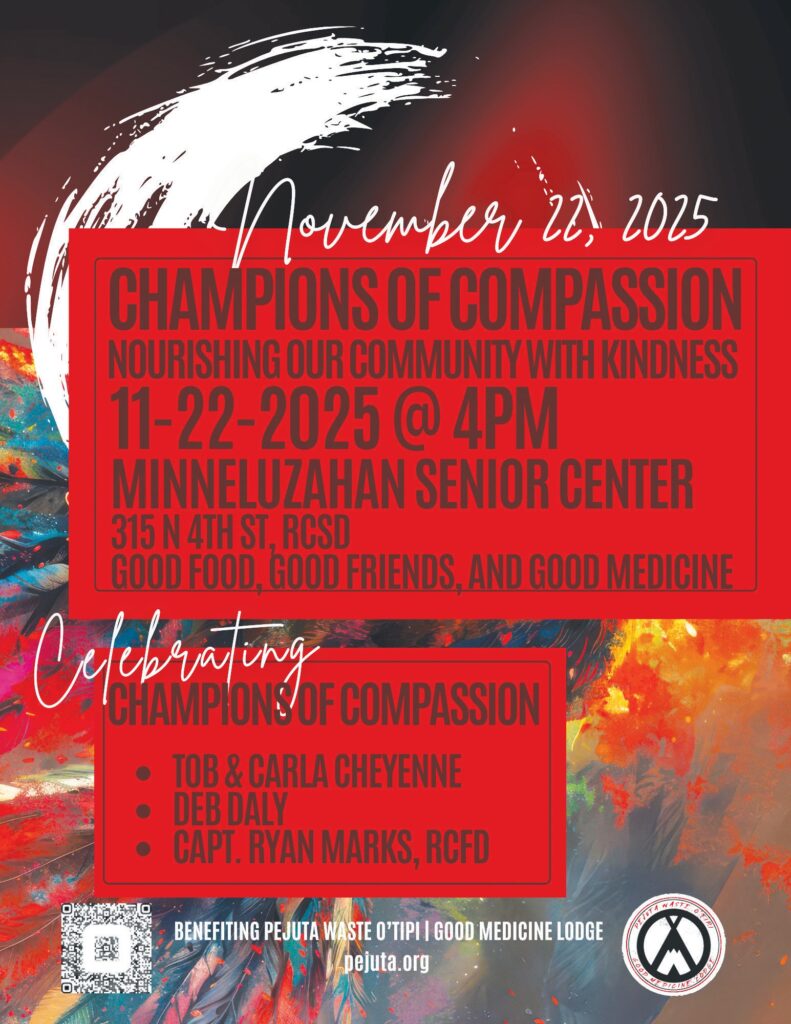 The Inaugural Fundraiser for Pejuta Waste O’Tipi | Good Medicine Lodge Saturday, November 22, 2025 | 4:00 PM Minneluzahan Senior Center – 315 N 4th St, Rapid City, SD 57701 RAPID CITY, SD —Join us for an evening of laughter, healing, and heart work as we gather in community