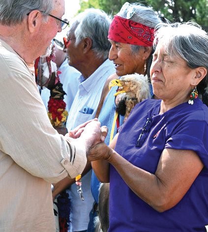 Karen Little Thunder and her cousin Phil Little Thunder greet attendees of a memorial ceremony in Ash Hollow State Historical Park Sept. 6, 2025. (Jessica Wade, Nebraska Public Media) Karen Little Thunder stood outside a small storage room within the Ash Hollow State Historical Park welcome center. She lit a