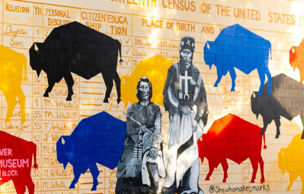 Mural created at the request of the Kingsley History Project in Broadus by Northern Cheyenne artist Miah Chalfont Realbird. (Photo by Clara Caufield) BROADUS, Mont – On Monday, September 22, a historic event took place in Broadus, Montana, a small town located on Highway 212 midway between Lame Deer on