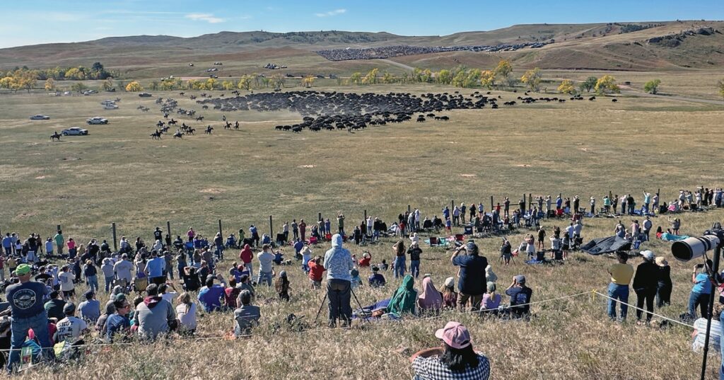 A crowd of spectators gather along a grassy hillside watching the annual Custer State park Annual Buffalo Round Up. (Photo by Mark Lonehill) CUSTER – The sun had barely crested the horizon on September 26, 2025, when the hills of Custer State Park began to stir. A crisp autumn breeze