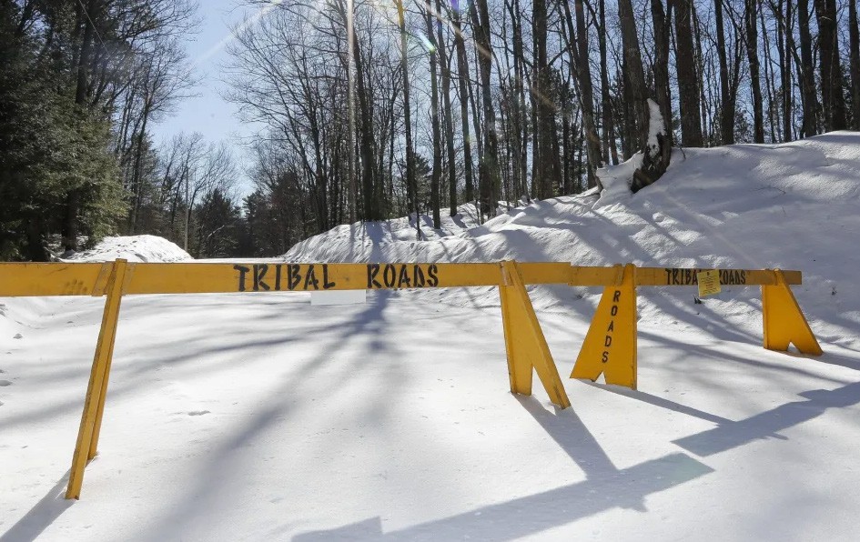 A roadblock is seen along Center Sugarbush Lane on Feb. 8, 2023, along Elsie Lake Lane in Lac du Flambeau, Wisconsin. The U.S. Department of Justice filed a lawsuit in 2023, to force the northern Wisconsin town to pay unspecified damages for failing to renew road access easements with the
