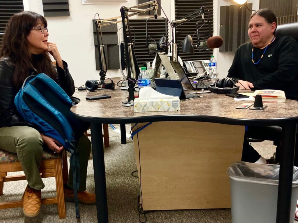 “Native America Calling” host Shawn Spruce talks with writer Deborah Jackson Taffa in KUNM’s Albuquerque studio, April 25. (Photo courtesy of Art Hughes) Across Indian Country, no tradition is as revered or timeless as that of oral narrative. For millennia, Natives conveyed their history, their legends and their values from