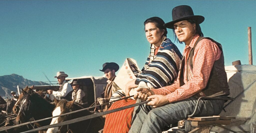 Dawn Little Sky (Standing Rock Sioux) and Eddie Little Sky (Oglala Lakota), pioneering Native American actors, ride together in a covered wagon in a scene from the 1960 Western epic Cimarron. Their presence in the film marked a rare moment of authentic Indigenous representation during an era dominated by non-Native