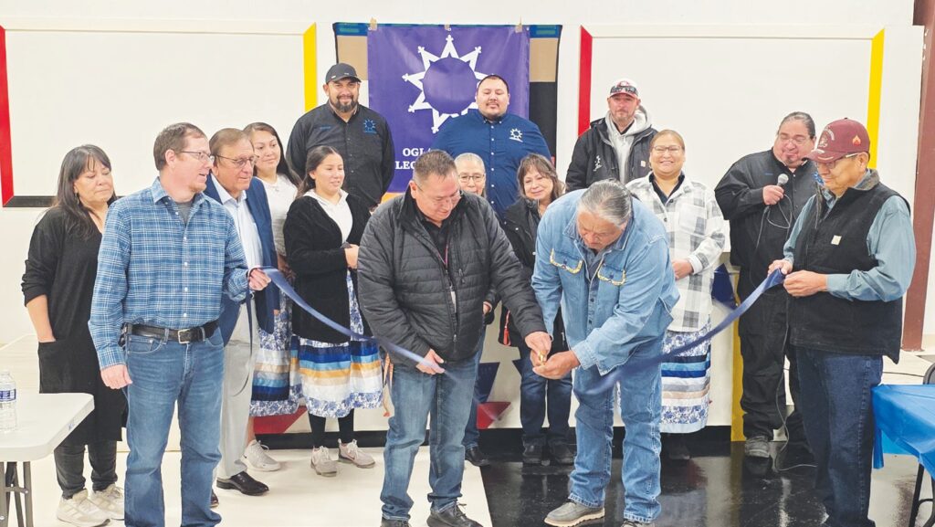 OST President Frank Star Comes Out, OLT staff and board members at ribbon-cutting ceremony at Wakpamni Lake Community Center. (Photo by Marnie Cook) WAKPAMNI COMMUNITY CENTER – After decades of struggling with poor internet connectivity, the Wakpamni Lake and Batesland communities celebrated a technological milestone Monday as Oglala Lakota Telecommunications