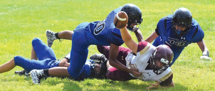 The Fighting Fourteen’s fullback Daveon Provost struggling for tough yards against Aberdeen Roncalli. (Photo by James Giago Davies) PINE RIDGE—Back when Mahpiya Luta was still called Red Cloud, Duane “Syrup” Big Crow coached a football team that deserves to be remembered as more than a footnote. The South Dakota High