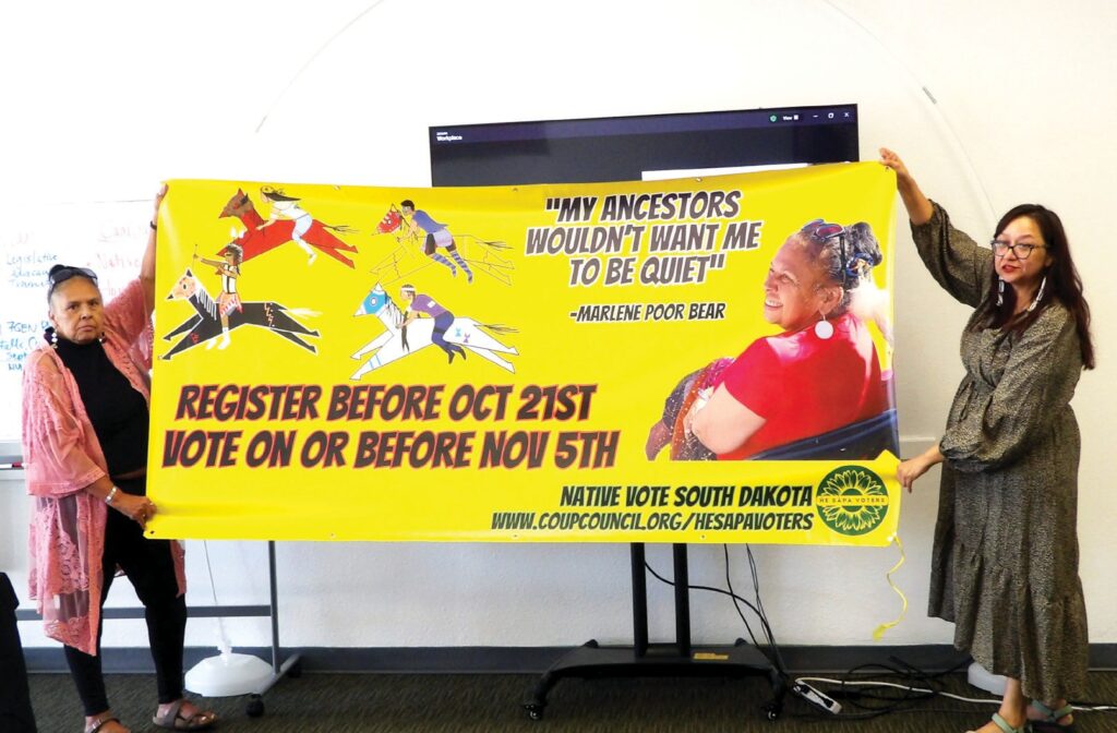 Marlene Poor Bear and Natalie Stites Means display banner to get out the Native vote. (Photo by Marnie Cook) RAPID CITY – There are already enough barriers for Native voters, but concerns have been growing over efforts to suppress voter access further, from the federal to the state level. Organizations