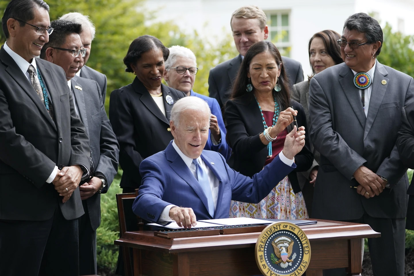 President Joe Biden hands a pen to Interior Secretary Deb Haaland as he signs a proclamation on the North Lawn at the White House in Washington, Oct. 8, 2021. (AP Photo/Susan Walsh, File)